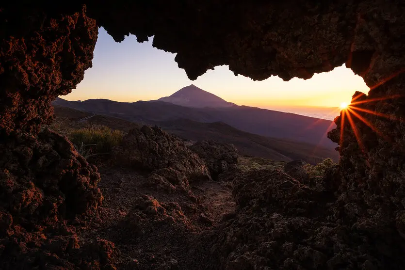 When shooting the sun directly, you may be able to capture both rays and starbursts at the same time, achieving a more complex and beautiful expression of light. Adding silhouettes of mountains or trees in the foreground enhances the presence of the rays and makes them stand out more vividly.