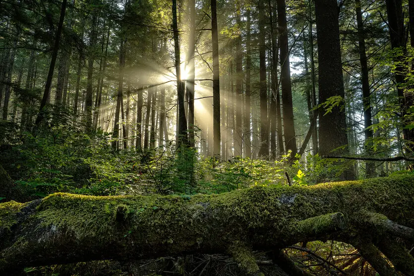 Using a slower shutter speed will make your images brighter and can help when photographing in low light, such as at dawn or dusk. In forest scenes with rivers, a slow shutter speed can also blur water flow into a soft, silky texture that complements the beams of light. However, longer exposures increase the risk of camera shake, so be sure to use a tripod when necessary.